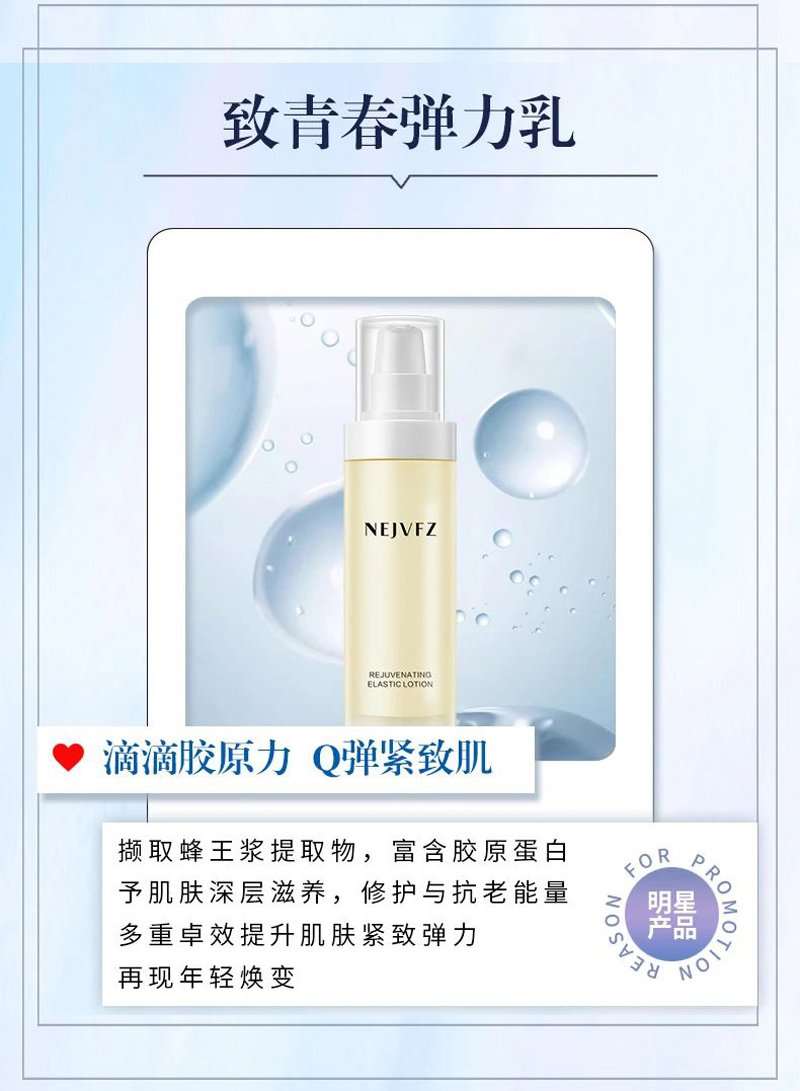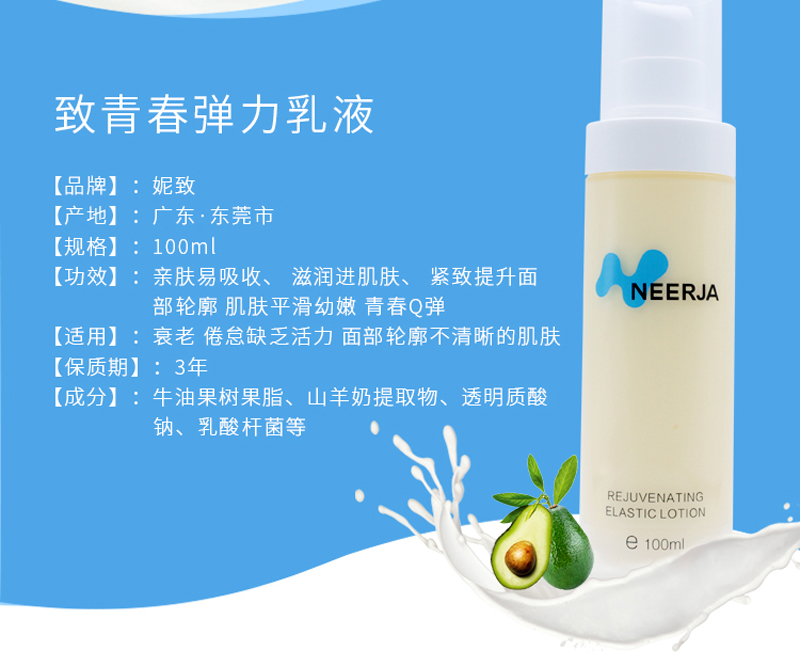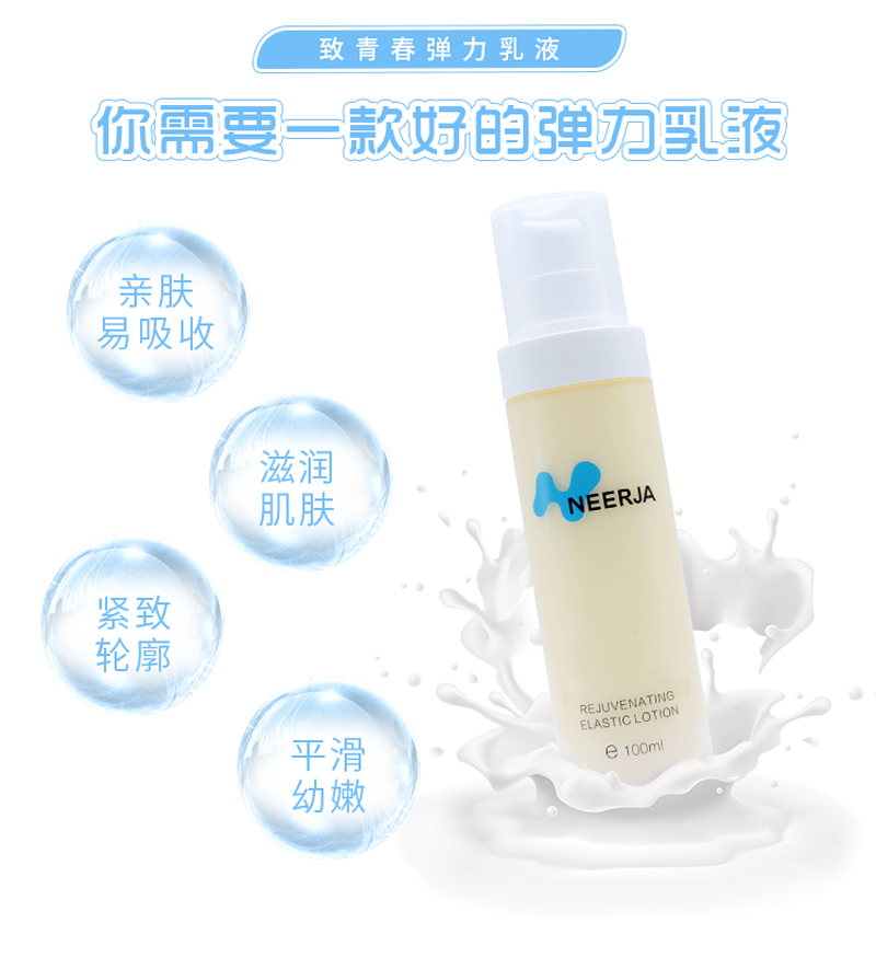 • 商品名称:妮致 致青春弹力乳液100ml 淡纹抗皱、紧致轮廓、弹润饱满、平衡幼嫩、滋润肌肤、青春Q弹