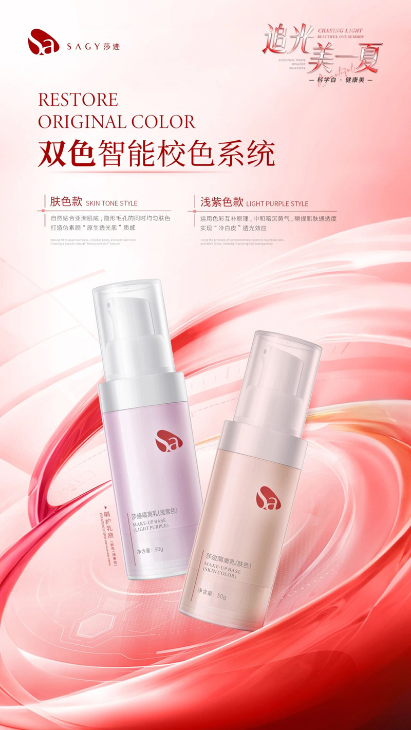 ①肤色:自然贴合亚洲肌底,隐形毛孔的同时均匀肤色,打造伪素颜“原生透光肌”质感。②紫色:运用色彩互补原理,中和暗沉黄气,瞬提肌肤通透度实现“冷白皮”透光效应。